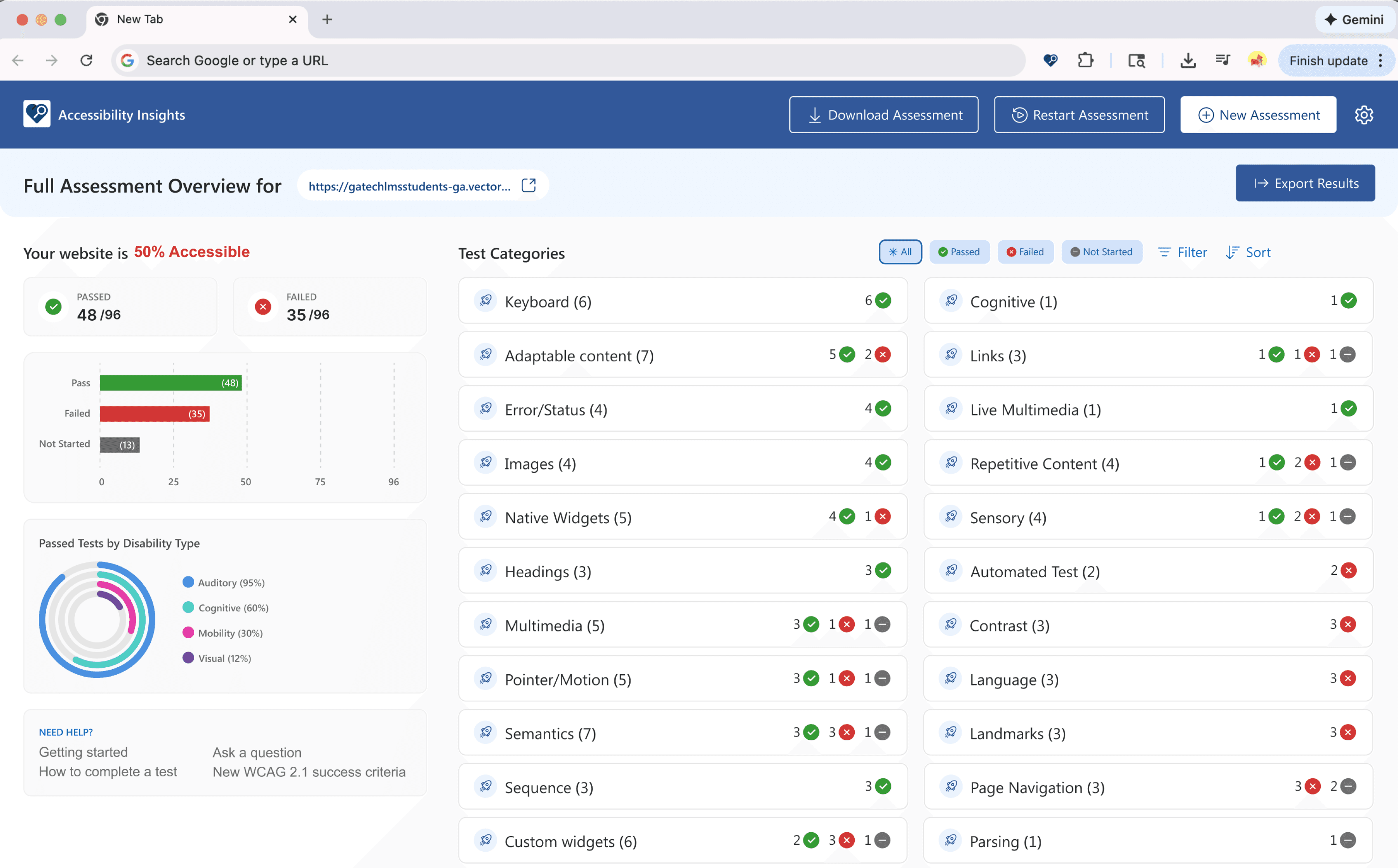 Add a overview page during full assessment test such that developers could have insightsful guidance about test status, category and disability types.