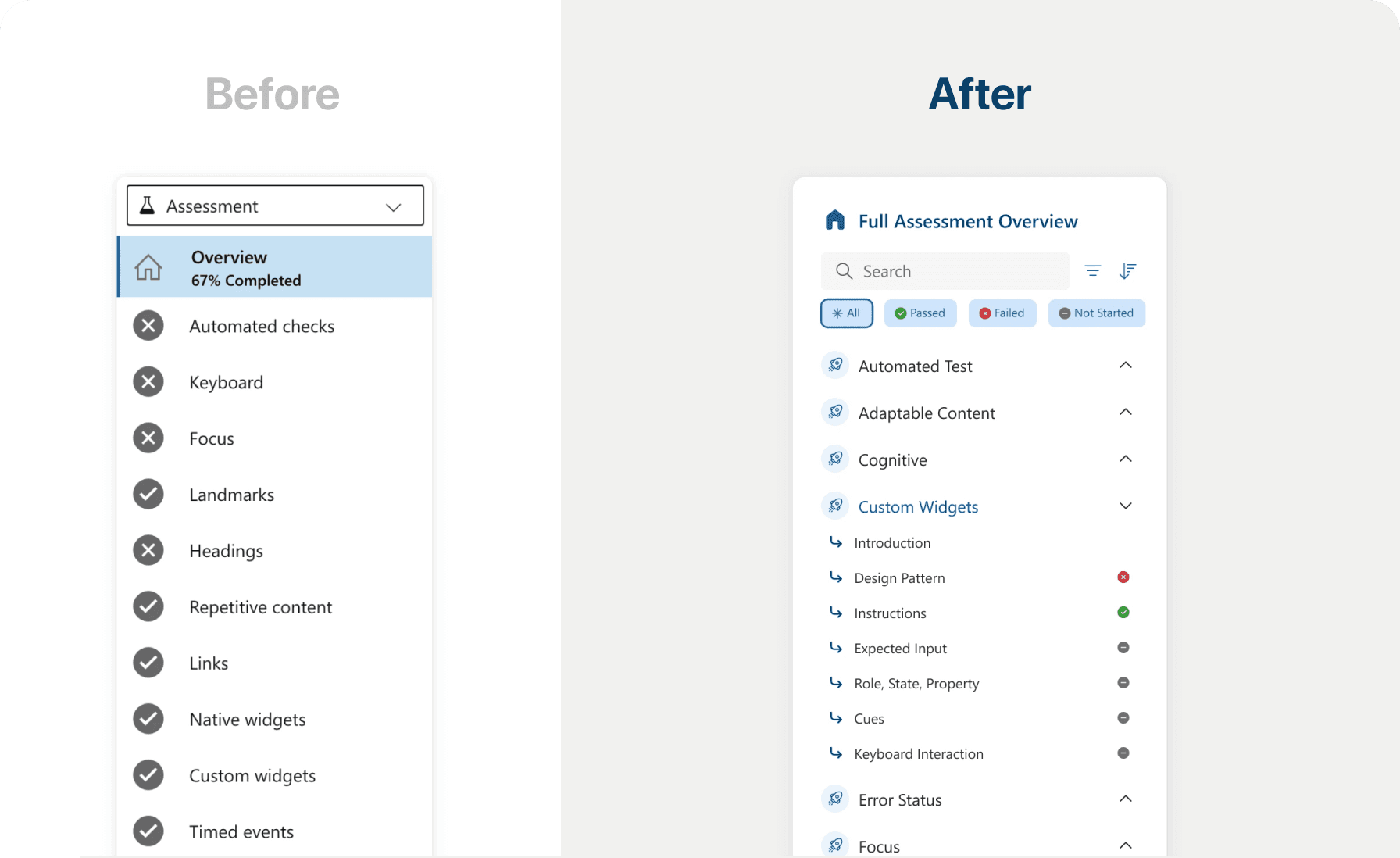 Allow sorting and filtering feature in the navigation bar and include a sub-level test status differentiation (pass/fail/not started) under each test category