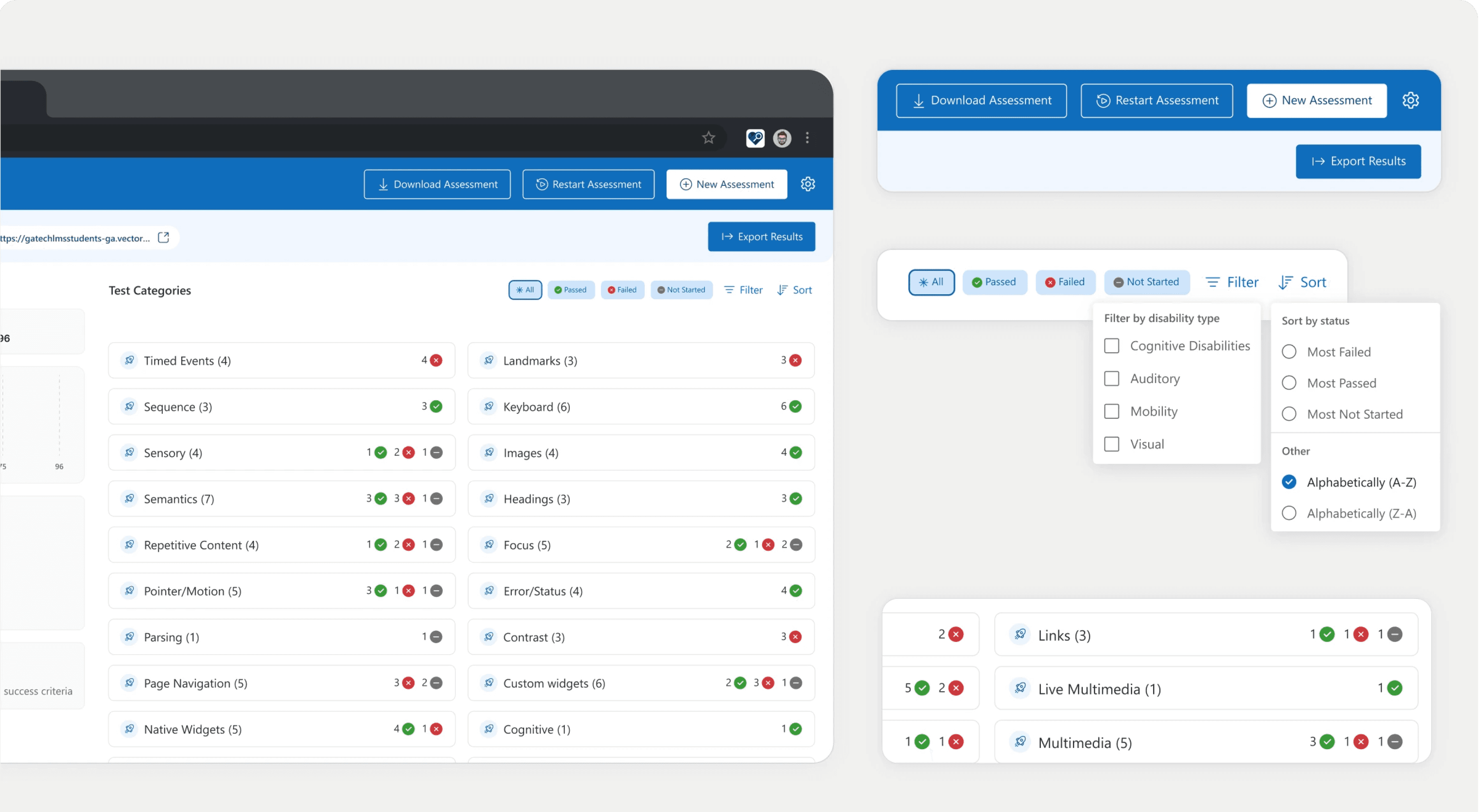 Implement a filtering and sorting system that allows developers to sort tests by disability types—such as visual, auditory, cognitive or mobility—as well as by pass/fail status.