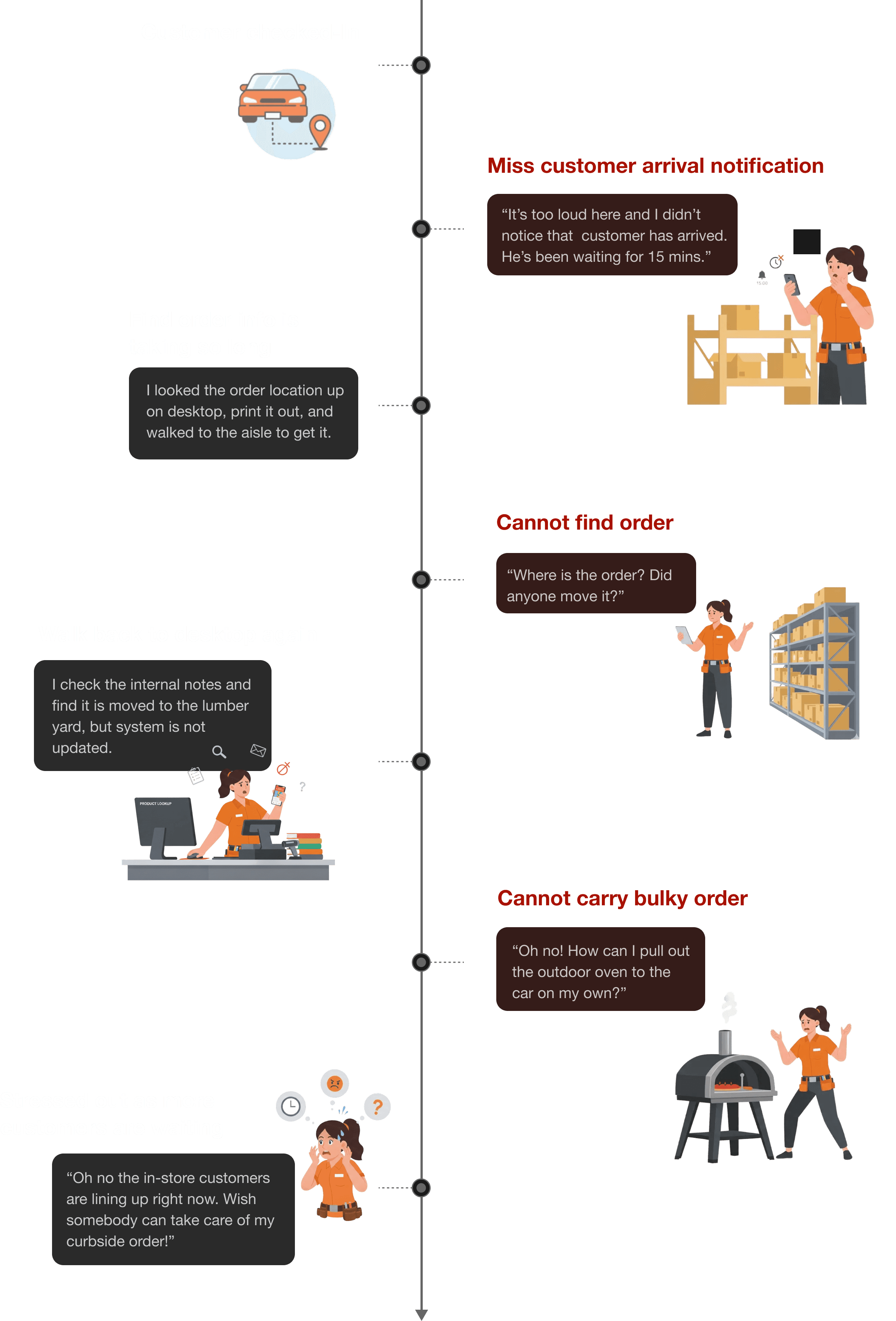 Store associates face multiple challenges with curbside order preparation due to fragmented tools and information gaps. This leads to confusion in order location and a critical lack of real-time awareness about customer waiting time and thus lower customer satisfaction.